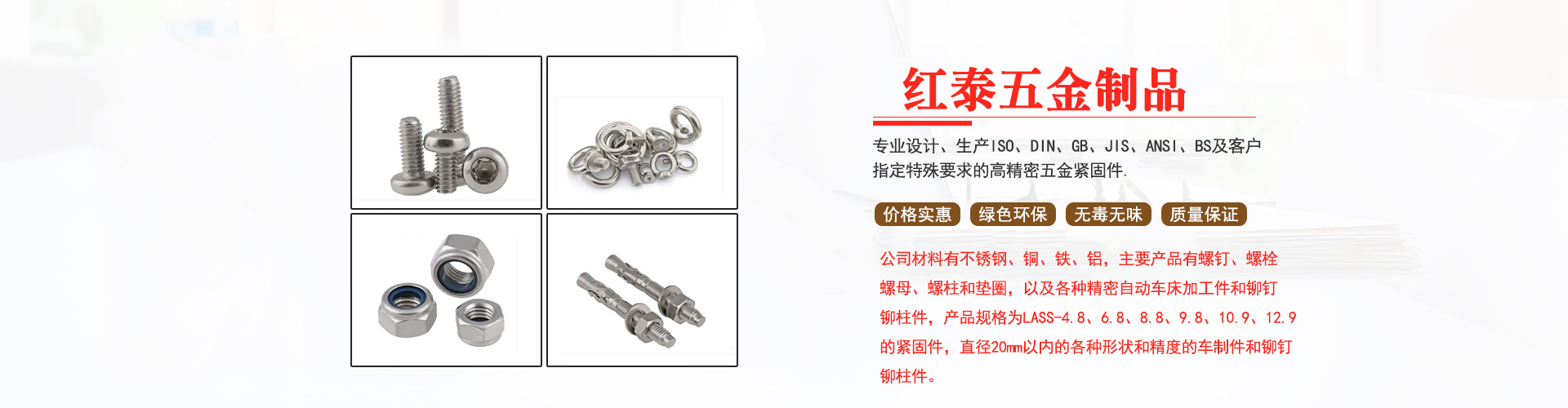 東莞市紅泰五金制品有限公司,公司占地六千多平方米,擁有五十多組螺絲機及六十臺自動車床設備。是一家專業設計、生產ISO、DIN、GB、JIS、ANSI、BS及客戶指定特殊要求的高精密五金緊固件的制造企業。